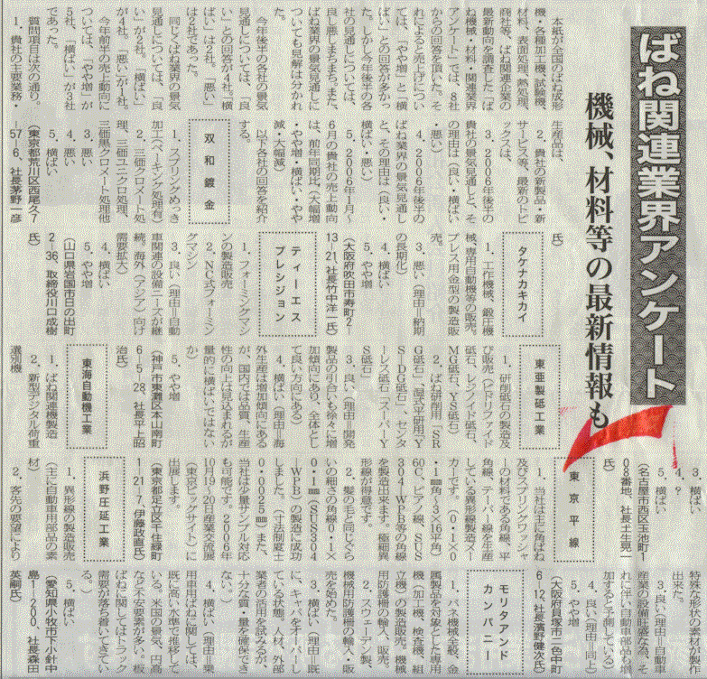 2006.9.1 ばね産業新聞の”ばねメーカーに向けての情報発信を目的としたアンケート調査”に掲載されました。