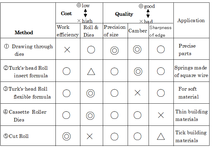 To produce precise parts, the recommended method is to draw the wire through dies (method 1). For economical mass production of thick square wire, cut roll (method 5) should be chosen. If both quality and cost are important, the Turk's-head roll insert formula (method 2) is the best option.