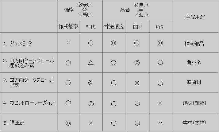 異形線製造方法と価格の関係 例えば、角線を加工する場合を考えましょう。当社では次の5種類の方法があります。 それぞれの角線加工方法と特徴は以下の通りです。 表1.角線加工方法と価格,品質の関係