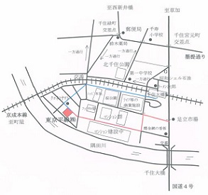 京成本線 千住大橋駅下車 徒歩8分。改札を出て、すぐ右折,また右折し、線路沿いの道を桜公園を左手に見ながら町屋方向に進み、右に踏切が見えたら、左の三叉路の中央の道を進み、クロネコヤマトを通過しすぐに左折して、20m先の右側が当社です。